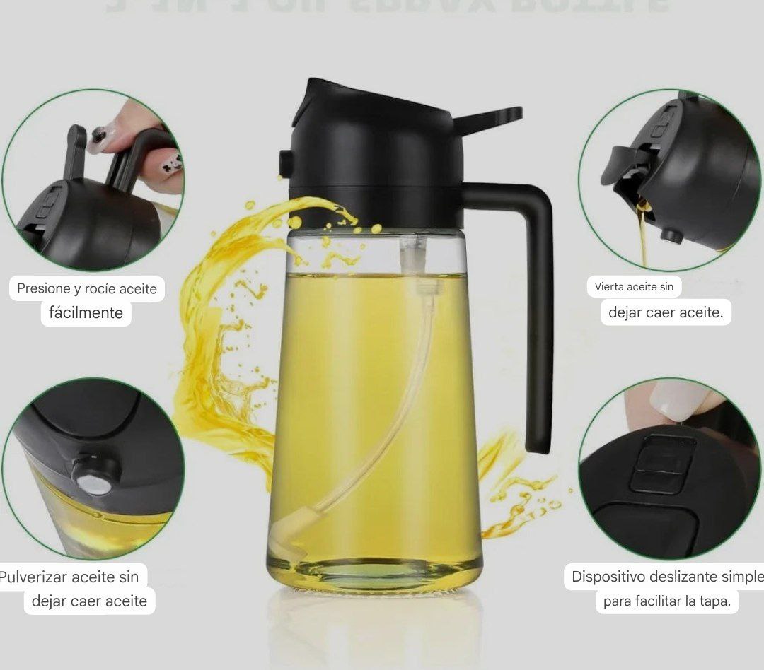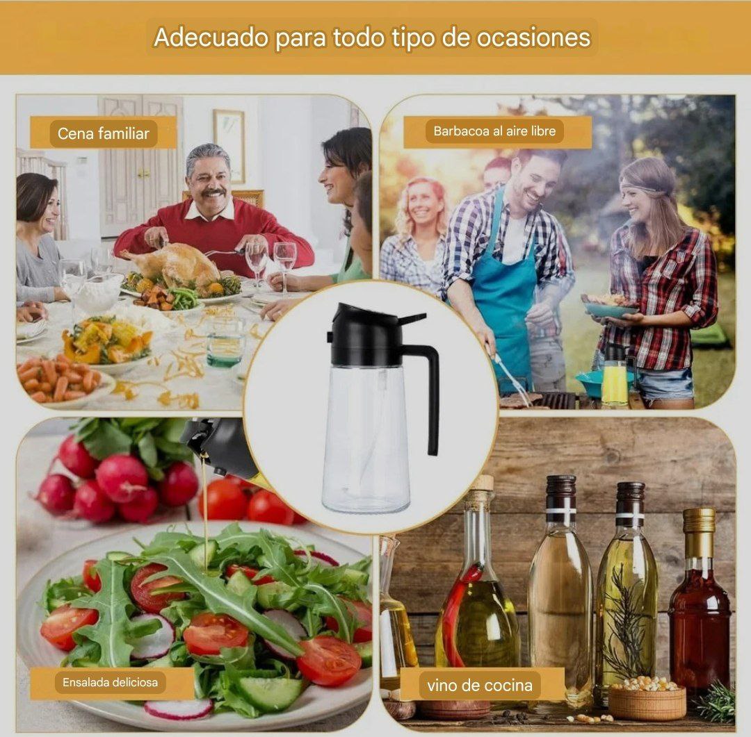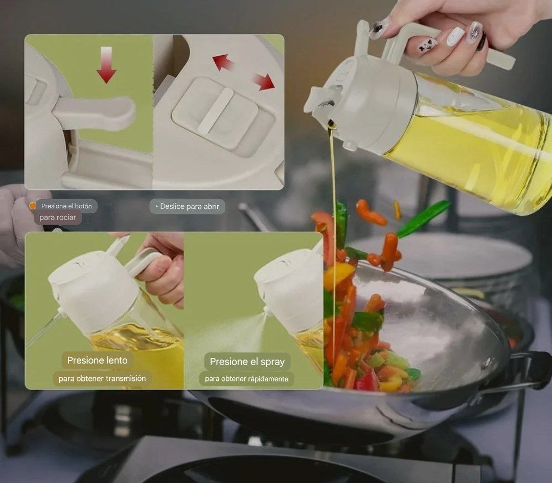 - Pulverización y Vertido: ¡Versatilidad incomparable! Utiliza la función de vertido para sazonar tus ensaladas y agregar un toque saludable a cualquier plato. Utiliza la función de pulverización para engrasar sartenes antes de freír o asar carne en la parrilla.