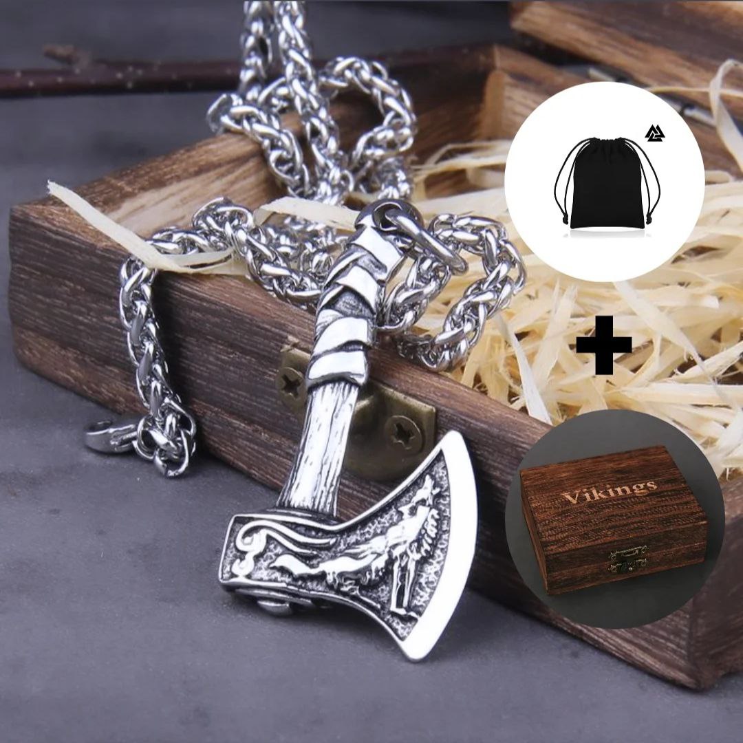 Nuestro colgante de doble cara Hacha Vikinga contiene tallados finos. Ambos lados del hacha están esculpidos con diferentes animales, en un lado un "cuervo nórdico" y en el otro un "lobo nórdico".